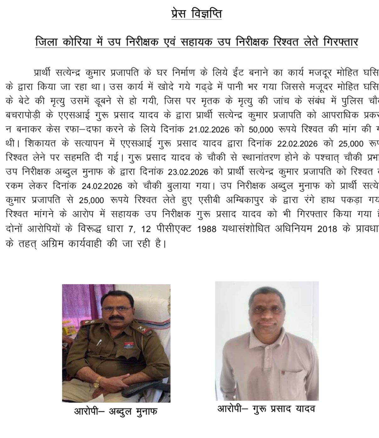 रायपुर/कोरिया, 24 फरवरी 2026।कोरिया जिले में भ्रष्टाचार के खिलाफ बड़ी कार्रवाई करते हुए एसीबी/ईओडब्ल्यू की टीम ने उप निरीक्षक और सहायक उप निरीक्षक को रिश्वत प्रकरण में गिरफ्तार किया है। दोनों अधिकारियों पर प्रार्थी से केस रफा-दफा करने के नाम पर रिश्वत मांगने का आरोप है।प्राप्त जानकारी के अनुसार, प्रार्थी सत्येंद्र कुमार प्रजापति के घर निर्माण के लिए ईंट बनाने का कार्य चल रहा था। इस दौरान खुदाई किए गए गड्ढे में पानी भर जाने से एक मजदूर के बेटे की डूबने से मृत्यु हो गई थी। मामले की जांच के दौरान चौकी बचरापोड़ी में पदस्थ सहायक उप निरीक्षक गुरु प्रसाद यादव ने प्रार्थी को आपराधिक प्रकरण में न फंसाने और केस खत्म करने के एवज में 50 हजार रुपये की रिश्वत की मांग की।शिकायत के सत्यापन के बाद 22 फरवरी को 25 हजार रुपये लेने पर सहमति बनी।
