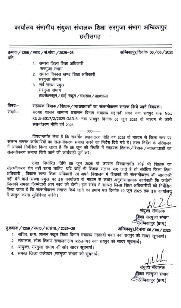 अम्बिकापुर : 7जून2025, संभागीय संयुक्त संचालक, शिक्षा सरगुजा संभाग अम्बिकापुर द्वारा एक कड़ा प्रशासनिक आदेश जारी किया गया है, जिसमें सभी जिला शिक्षा अधिकारियों, विकासखण्ड शिक्षा अधिकारियों और शासकीय विद्यालयों के संस्था प्रमुखों को 5 जून 2025 की स्थिति में कार्यरत सभी संलग्न शिक्षकों (सहायक शिक्षक, शिक्षक, व्याख्याता) का संलग्नीकरण तत्काल प्रभाव से समाप्त करने के निर्देश दिये गये हैं।यह निर्देश छत्तीसगढ़ शासन सामान्य प्रशासन विभाग द्वारा जारी स्थानांतरण नीति वर्ष 2025 के परिपालन में दिया गया है। उक्त नीति के अनुसार, जिला स्तर पर संलग्न समस्त कर्मचारियों का संलग्नीकरण समाप्त करना अनिवार्य किया गया है।