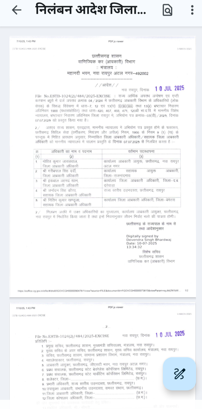 साय सरकार की बड़ी कार्रवाई,बहुचर्चित शराब घोटाला मामले से जुड़े अधिकारियों को किया निलंबित Uncategorized July 10, 2025July 10, 2025HNS24 NEWS0 रायपुर : 10जुलाई2025,छत्तीसगढ़ के बहुचर्चित शराब घोटाला मामले में साय सरकार ने की बड़ी कार्रवाई, रायपुर, बिलासपुर,दुर्ग,बालोद,महासमुंद सहित राज्य के 22 आबकारी अधिकारियों को किया गया निलंबित, राज्य सरकार ने किया आदेश जारी ,लिस्ट देखें….